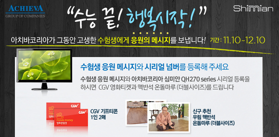 PC모니터 전문회사 아치바코리아가 수학능력시험을 마친 이들을 위해 이벤트를 마련했다. 수험생 응원 메시