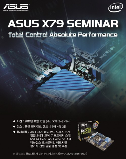 아수스(대표 케빈 두 kr.asus.com)는 용산 전자랜드 랜드시네마에서 오는 16일 수요일 오후 2시부터 5시까지 인텔 2세대 i7 프로세서 익스트림 에디션을 지원하는 X79 마더보드 출시 기념 유저 세미나를 개최한다고 밝혔다.
