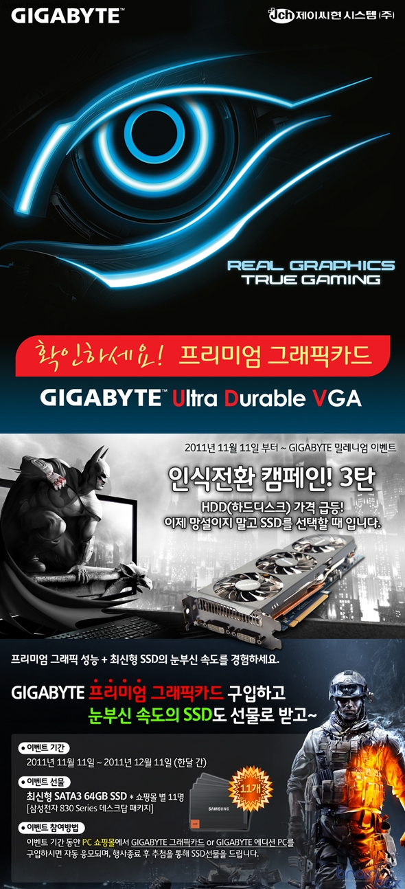 “프리미엄 그래픽 성능 + 최신형 SSD의 눈부신 속도를 경험하세요.”라는 컨셉으로 진행되는 이번 이벤트는 제이씨현시스템㈜에서 인식전환 캠페인 및 밀레니엄 빼빼로 데이를 기념하고자 준비한 특별 사은행사이다. GIGABYTE 그래픽카드를 구입하시는 소비자들께 혜택을 드리는 이벤트로 해당 기간 동안 PC쇼핑몰에서 GIGABYTE 그래픽카드 or GIGABYTE 에디션 PC를 구입하면 자동 응모되며 이벤트 종료 후 추첨을 통해 최신형 SATA3 64GB SSD를 쇼핑몰 별 11분께 선물로 드린다. 제이씨현시스템㈜의 관계자는 “최근 하드디스크 가격급등 때문에 PC산업이 전반적으로 침체되어 있다. 자연재해로 발생한 Issue라는 점에서 뚜렷한 대책이 없는 지금, 우리가 선택할 수 있는 길은 하드디스크를 대체할 수 있는 SSD를 선택할 때라고 생각한다. 초고속 인터넷 속도를 기반으로 PC내의 자료관리만 잘 한다면 굳이 고용량의 하드디스크가 급하게 필요하진 않을 것이다. 이번 이벤트는 PC구매 및 업그래이드를 목전에 둔 소비자들을 위해 준비하였으며, 이를 계기로 인식전환의 계기가 만들어 지기를 바란다!”라고 이벤트 진행 목적을 밝혔다. |