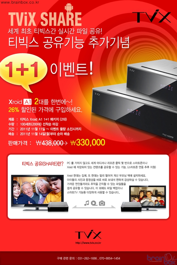 가정용 디지털 멀티미디어 기기 전문 기업 ㈜미네박스(대표 임창빈)가 스마트TV 기능을 탑재한 신개념 홈 멀티미디어 기기 "티빅스 XROID A1"를 실속 있게 구입할 수 있는 ‘1+1’ 할인 이벤트를 진행한다고 밝혔다. 티빅스 XROID A1은 국내는 물론 해외 50여 거래선을 통해 판매되고 있는 안드로이드 OS 기반의 대표 제품이다. 이번 ‘1+1’ 할인 이벤트는 11월 11일부터 이벤트 물량 소진시까지 진행되며, 2대의 기존 가격 438,000원에서 26% 할인된 330,000원에 구입할 수 있다. 기간 중 옥션, G마켓, 11번가, 인터파크에 접속하면 누구나 이벤트 가격으로 티빅스 XROID A1을 받을 수 있다.