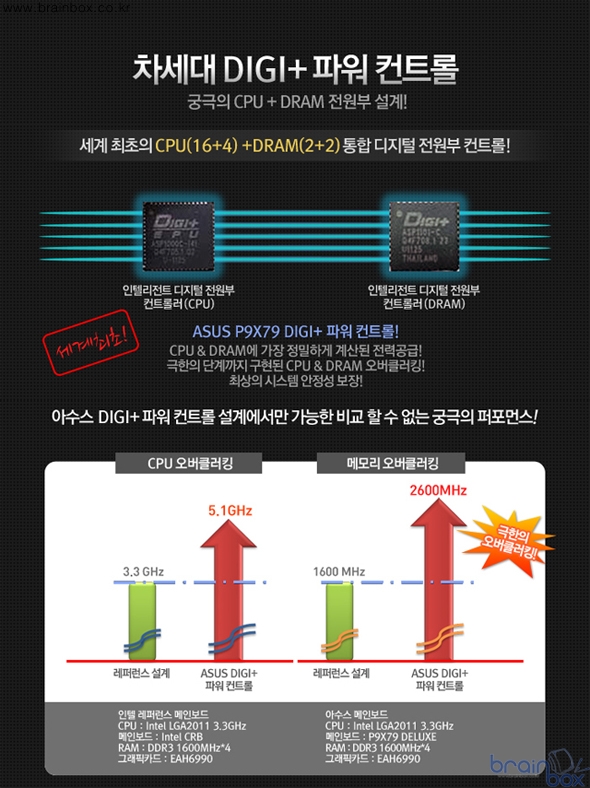 X79 메인보드는 더 커진 CPU와 최대 64GB DRAM 메모리를 사용하기 때문에 이전 세대들과는 차별화되는 가장 정밀한 디지털 전원부 컨트롤 기술이 요구된다. 이러한 시대의 요구에 부응하는 기술이 아수스 New DIGI+ 파워 컨트롤 기술이다.