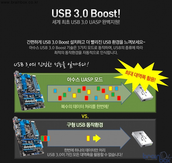 아수스 P9X79 시리즈에서 주목해야할 또 다른 기술은 아수스 SSD 캐싱 기술이다. 인텔 Z68칩셋에 도입된 SSD 캐싱 기술은 아쉽게도 X79 칩셋에서는 지원하지 않지만 아수스 메인보드를 사용한다면 실망은 금물이다 지난 인텔 SSD캐싱 기술에서 지적되었던 복잡한 설정, 데이터 백업 기능 등 단점을 완벽하게 보완했다. 아수스만의 독자적인 기술로 3배 빠른 데이터 전송 속도를 보여주며 고속의 SSD와 고용량의 HDD를 모두 사용하는 사용자들에게 아수스 P9X79 시리즈는 최고의 선택이 될 것이다. P9X79 PRO 메인보드는 풍부한 확장성으로 사용자를 만족시켜준다. nVIDIA SLI와 ATI CrossFire 모두 지원하는 총 4개의 PCIe 3.0 x16 슬롯이 장착되어 있으며 6개의 SATA 6G 포트(eSATA 2개 포함), USB 3.0 포트 6개, BT GO 블루투스 등 풍부한 확장성을 제공한다. P9X79 PRO에는 아수스 USB 3.0 부스트 기술이 적용됐다. USB 3.0의 대역폭을 최대한 활용해 기존 USB에 비해 최대 170%의 성능이 향상되었으며, 기존의 장비와도 완벽하게 호환된다