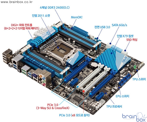 P9X79 PRO에 장착된 New DIGI+ 파워 컨트롤 전원부는 CPU와 DRAM 전원부를 디지털 방식으로 통합적으로 관리해 샌디브릿지-E CPU의 성능을 극한까지 끌어낸다. 이 외에도 최대 64GB까지 지원가능한 8개의 메모리슬롯, 차세대 PCIe 3.0 규격 기본 지원, USB 3.0 BOOST, 아수스 SSD 캐싱 등 사용자를 충분히 만족시킬 수 있는 탄탄한 구성을 갖췄다.