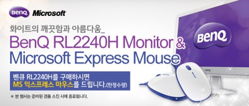 벤큐코리아는 국내 주요 쇼핑몰을 통해 RL2240H 모니터를 소비자가격은 18만 9000원에 판매하며, 11월 22일까지 모니터를 구매한 고객에 한하여 마이크로소프트 익스프레스 마우스를 무상 증정한다.