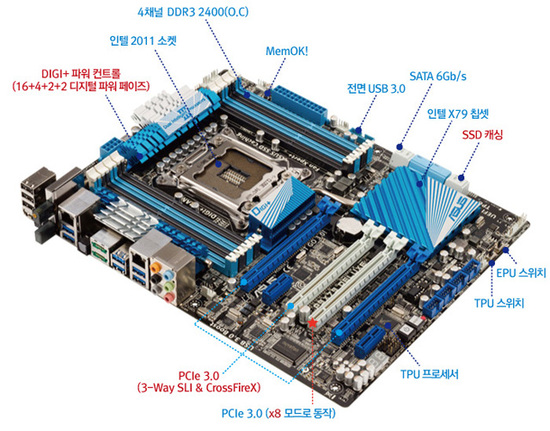 아수스 SSD 캐싱 기술이 탑재된 것도 특징. 인텔 Z68칩셋에 도입된 SSD 캐싱 기술은 X79 칩셋에서는 지원하지 않지만 아수스 메인보드는 이 기술을 도입했다.
