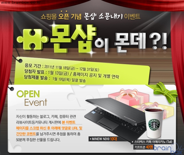 ㅇ 모뉴엘 쇼핑몰 ‘몬샵(www.monshop.co.kr) 오픈기념 소문내기 이벤트 진행 세계가 인정하는 글로벌 IT기반 종합가전기업 ㈜모뉴엘(www.moneual.com)이 18일 인터넷 쇼핑몰 몬샵(www.monshop.co.kr)을 오픈하고 대대적인 상품 증정 이벤트를 진행한다.