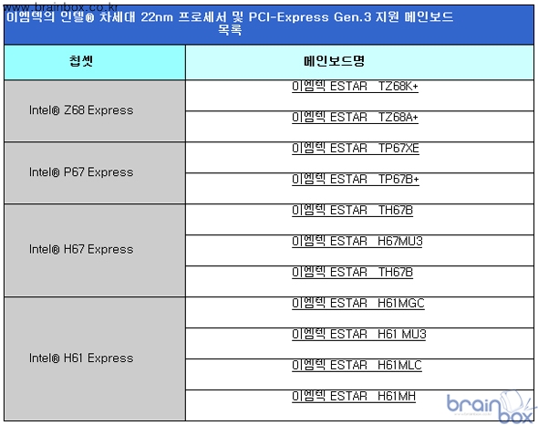 - 바이오스 업데이트만으로 차세대 22nm 공정 프로세서와 PCI-Express Gen3 지원. 국내 컴퓨터 컴포넌트 시장을 선도하고 있는 (주)이엠텍아이엔씨(대표:이덕수, www.emtekinc.com)는 자사의 인텔 6시리즈 메인보드가 3세대 PCI-Express 신호 테스트를 통과하고 차세대 22nm CPU의 사용이 가능하다고 밝혔다.