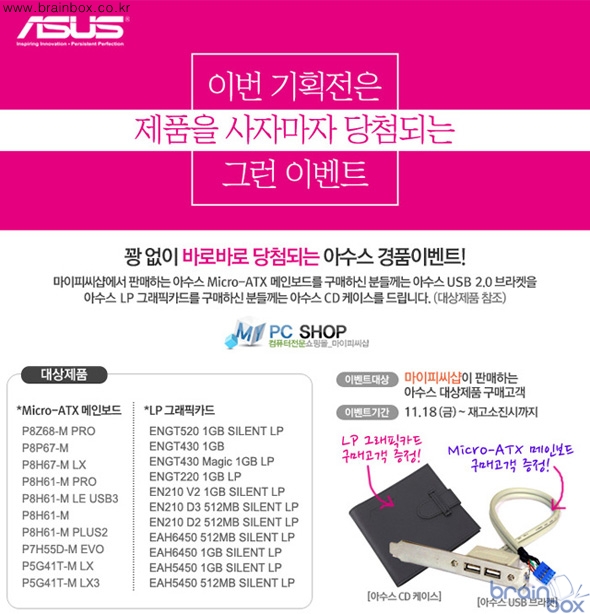 ASUStek사의 국내유통사인 에스티컴퓨터(http://www.stcom.co.kr , 대표 서희문)는 현재 직영 쇼핑몰인 아수스존(www.asuszone.com)에서 펼쳐지고 있는 Micro-ATX 메인보드와 LP형 그래픽카드를 구매하는 전원에게 사은품을 증정하는 이벤트를 고객성원에 힘입어 옥션 등 오픈마켓으로 확대 실시한다. 이벤트 대상 제품으로는 EAH6450 512MB SILENT LP 등 그래픽카드 11종 P8H61-M PLUS2 등 메인보드 10종 이다. 그래픽카드를 구매하는 분에게는 아수스 CD케이스를 증정하며, 메인보드 구매자에게는 USB 브라켓을 증정한다.