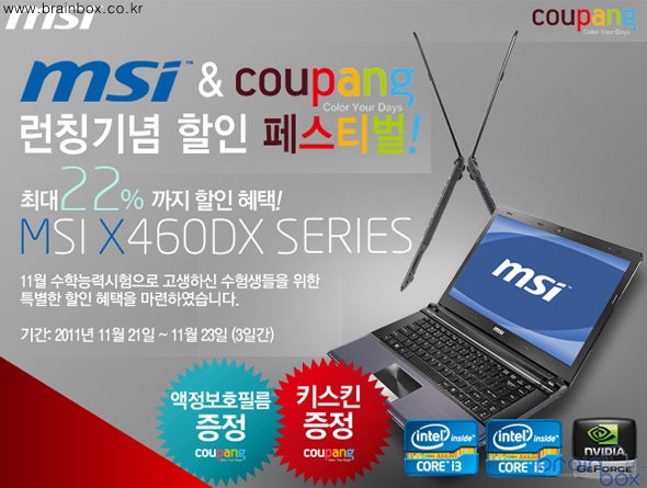 쿠팡 첫 런칭을 기념하여 쿠팡에서 선보이는 2011년형 신모델인 MSI X-Slim X460DX-i3 Fantasia S2 모델의 경우 최대 22% 까지 할인폭을 넓혔으며, MSI X-Slim X460DX-i3 Fantasia S2모델은 최대 14%까지 금액할인이 적용된다. 또한 WINDOW7 HOME 32Bit 운영체제가 포함되있는 패키지 상품도 판매하여 구매의 선택 영역을 넓혔다는 것이 관계자의 설명이다. |