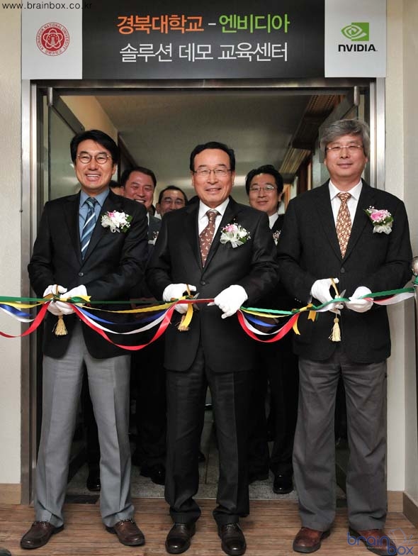 <사진1> 엔비디아 솔루션 데모 교육센터 오픈 기념 테이프 컷팅식에 참석한 엔비디아 코리아 이용덕 지사장, 경북대 함인석 총장 및 김상욱 정보전산원장(왼쪽부터) 21일 경북대학교 함인석 총장과 엔비디아 코리아 이용덕 지사장의 축사로 시작된 개원식에는 경북대학교 김상욱 정보전산원장, 라이트커넥트코리아(Right Connect Korea) 박수진 대표이사, 델 코리아(Dell Korea) 하정욱 상무, 에스엔텍(SNTEC) 이상현 대표이사, 실리콘스튜디오 코리아(Silicon Studio Korea) 이규재 대표 등 교육센터 구축에 협력한 국내외 기업 대표들이 참석했다. 이어 진행된 기술 세미나에서는 GPU를 이용한 렌더팜 및 클라우드 컴퓨팅 기술 동향, 제 3세대 컨텐츠 제작 솔루션 등 GPU를 활용한 시각화 및 슈퍼컴퓨팅 솔루션이 소개돼 관심을 불러모았다. 경북대 정보전산원내 개원한 엔비디아 솔루션 데모 교육센터는 다양한 컴퓨팅 솔루션 교육, 컨설팅 및 개발을 한 번에 해결할 수 있는 올인원(All-in-one) 체험 및 교육의 장으로, 테슬라(Tesla) 슈퍼컴퓨터, 개인용 슈퍼컴퓨터 시스템, 그래픽 전문가용 쿼드로(Quadro) 워크스테이션, 3D 스테레오, 원격 그래픽 등 직접 체험해 볼 수 있는 최신 3D 및 슈퍼컴퓨터 데모룸과 컨퍼런스룸을 갖추고 있다.