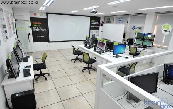 <사진2> 경북대 정보전산원에 개원한 엔비디아 솔루션 데모 교육센터 전경 개원 후 엔비디아 솔루션 데모 교육센터에서는 CAD와 워크스테이션 사용자, 방송 관계자, 학술연구단체, 슈퍼컴퓨터 사용자 등 그래픽과 고성능 컴퓨팅을 요하는 소비자들을 지원하고, 솔루션 구매자를 위한 제품 및 전문가 조언을 한번에 제공하는 논스톱 서비스 제공할 예정이다. 이번 센터 설립에는 엔비디아와 델(Dell)을 비롯해, 에스엔텍(SNTEC), 실리콘스튜디오 코리아(Silicon Studio Korea), 메타리버(Metariver), 앤시스(ANSYS), 펑션베이(Functionbay), 클로(CLO), 어도비(Adobe), RTT, 벙크스피드(BunkSpeed), 라이트커넥트코리아(Right Connect Korea), VM웨어(VMWare) 등 다양한 하드웨어 및 소프트웨어 업체들이 엔비디아 솔루션 데모 교육센터 설립에 참여했다. 엔비디아는 GPU 시스템의 효율적인 사용과 GPU 병렬 컴퓨팅 기술 전파를 위해 매월 다양한 기술 교육과 세미나를 비롯, 엔비디아 코리아 인턴 제도를 운영해 실무 인재 양성을 지원하게 되며, 서버 가상화 소프트웨어인 VM웨어(VMware) 기술을 바탕으로 클라우드 컴퓨팅 시장을 주도하고 있는 에스엔텍은 솔루션 센터 운영을 맡아 기술 전파의 중심적인 역할을 하는 동시에 학생들의 참여를 장려하기 위하여 매년 1,000만원의 장학금을 지원할 예정이다. |