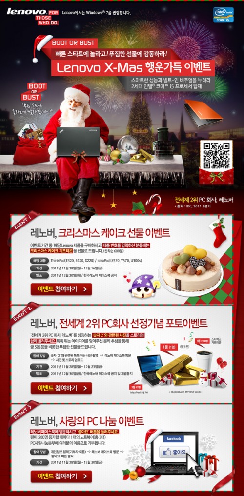 이번 크리스마스 케이크 행사 이벤트에는 씽크패드 X220이나 Edge E120, E320 또는 아이디어패드Z570, Y570, U300s노트북을 구매한 고객은 누구나 참여할 수 있다.