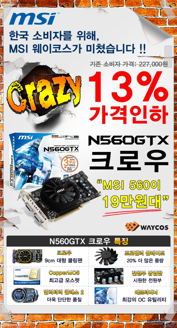 - MSI N560GTX 크로우 13% 가격인하 단행 세계 최고의 VGA 제조 기술력을 갖춘, MSI의 한국 공식 디스트리뷰터인 ㈜웨이코스(대표:고민종)가 MSI N560GTX 크로우 제품의 가격을 지포스 560 최저가를 목표로 파격적인 가격인하를 단행한다.