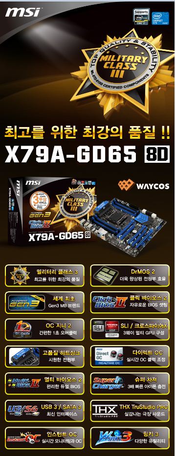 웨이코스(대표 고민종 www.waycos.co.kr)가, 최신 인텔 X79 칩셋 기반에 새로운 밀리터리 클래스 3 디자인을 적용한 ‘MSI X79A-GD65 (B3)’ 메인보드를 출시했다.