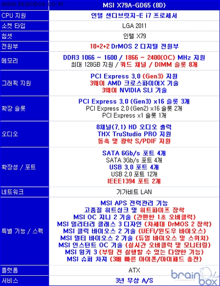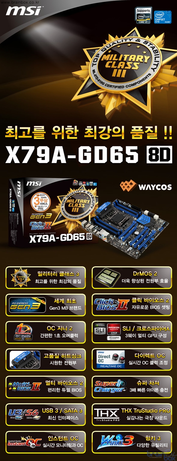 세계 정상급 토탈 IT 솔루션 제조사, MSI의 한국 공식 디스트리뷰터인 ㈜웨이코스(대표:고민종)가, 최신 인텔 X79 칩셋 기반에 새로운 밀리터리 클래스 3 디자인을 적용한 ‘MSI X79A-GD65 (B3)’ 메인보드를 출시했다.