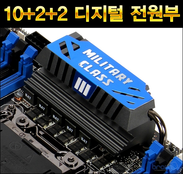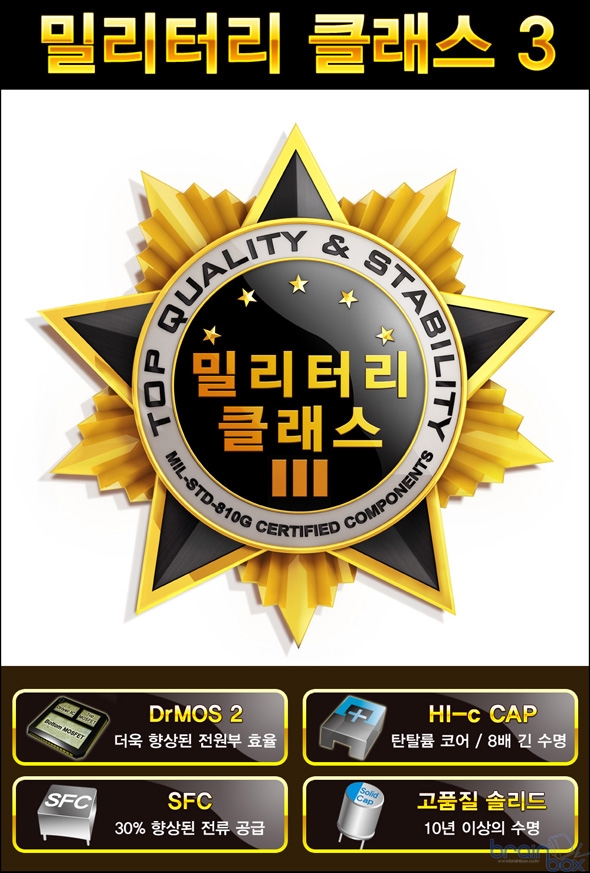밀리터리 클래스 3 디자인에 새롭게 추가된 DrMOS 2칩셋은, 기존 칩셋에 비해 온도에 따라 2중으로 시스템을 보호할 수 있는 기능이 추가되었으며, Low-Side RDS(on) 값이 기존 DrMOS 칩보다 더 낮아져 발열량이 줄어들었으며, 칩 내부에 흐를 수 있는 전류의 양이 증가되어 전원부 효율이 더욱 증가한 특성을 제공한다.