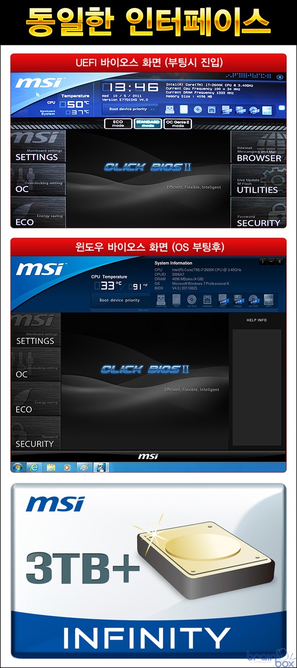 클릭 바이오스 2 ? 자유로운 바이오스 셋팅 MSI X79A-GD65 (8D) 메인보드는 자유로운 바이오스 셋팅을 위하여 클릭 바이오스 2 기술을 제공한다. 클릭 바이오스 2 기술은 소비자가 자유롭게 바이오스 셋팅을 할 수 있도록, 기존의 UEFI 바이오스와 함께 윈도우(운영체제) 에서도 바이오스 셋팅을 할 수 있는 프로그램이 제공된다.