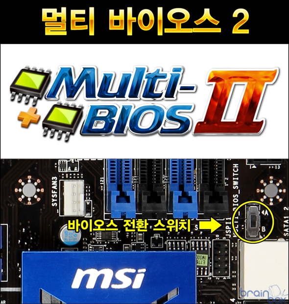 2개의 바이오스 셋팅 화면은 기본적으로 동일한 인터페이스를 채택하여 소비자의 혼동을 최소화 하였으며, 마우스를 통한 간편한 조작은 물론 최신 3TB 하드디스크까지 문제없이 사용할 수 있는 특징을 제공한다. 멀티 바이오스 2 ? 편리한 듀얼 바이오스 MSI X79A-GD65 (8D) 메인보드는 멀티 바이오스 2 기술을 통해 듀얼 바이오스를 기본 제공한다. 멀티 바이오스 2 기술은 메인보드 기판상에 바이오스 전환 스위치를 제공하여, 소비자가 어떤 바이오스를 사용할 것인지 직접 선택할 수 있으며, 오버클럭이나 기타 오류로 한쪽 바이오스에 문제가 생기면 2번째 바이오스로 부팅하여 문제가 발생한 첫번째 바이오스를 손쉽게 복구할 수 도 있다.
