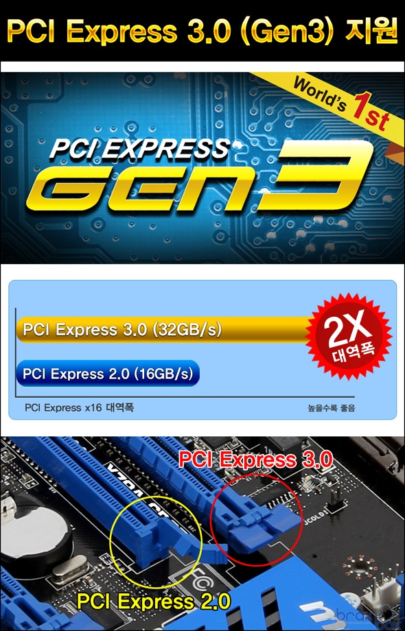 차세대 PCI Express 3.0 (Gen3) 공식 지원 MSI X79A-GD65 (8D) 메인보드는 차세대 인터페이스인 PCI Express 3.0 을 공식 지원하는 제품이다. 차세대 PCI Express 3.0 인터페이스는 기존 PCI Express 2.0 인터페이스에 비해 2배 더 많은 대역폭(32GB/s) 을 제공한다.