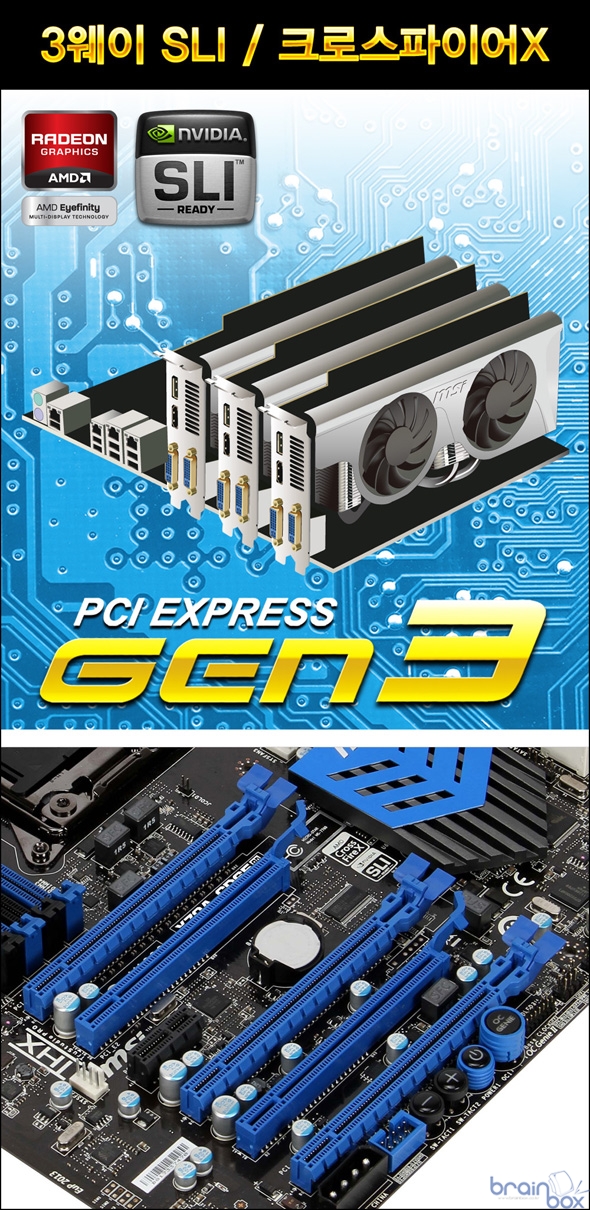3웨이 Gen3 SLI / 크로스파이어X 공식 지원 MSI X79A-GD65 (8D) 메인보드는 강력한 3D 게이밍 지원을 위해, Gen3 모드로 3웨이 SLI 및 크로스파이어X 멀티 그래픽 기술을 지원한다. 2웨이 SLI / 크로스파이어X 모드에서는 Gen3 x16 / x16 모드로 동작하며, 3웨이 SLI / 크로스파이어X 모드에서는 Gen3 x16 / x16 / x8 모드로 동작하게 된다.
