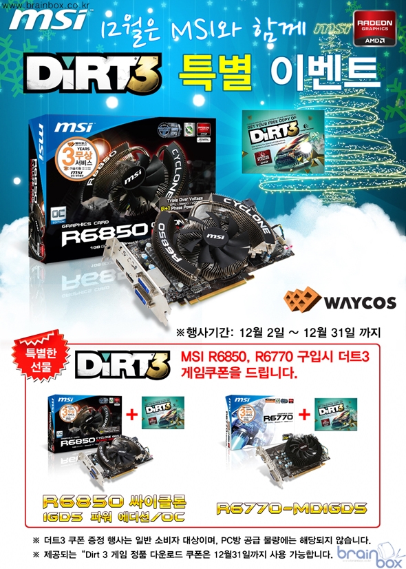 - MSI R6850 / R6770 VGA 구입 시, 최신 더트 3 게임쿠폰 증정 세계 최고의 VGA 제조 기술력을 갖춘, MSI의 한국 공식 디스트리뷰터인 ㈜웨이코스(대표:고민종)가 MSI 고성능 라데온 R6850 / R6770 그래픽카드 구입시, 최신 ‘Dirt 3’ 게임쿠폰을 증정하는 특별 프로모션을 실시한다. 금번 행사는 AMD 대표 그래픽카드로 꾸준한 인기를 누리고 있는 MSI R6850 / R6770 VGA 제품에 적용되는 특별 게임쿠폰 프로모션이다. 이번 특별 프로모션 기간 동안 MSI R6850 싸이클론 / R6770-MD1GD5 그래픽카드를 구매하는 소비자에게는, 최신 인기 레이싱 게임인 “Dirt 3” 게임을 즐길 수 있는 정품 디지털 다운로드 쿠폰이 제공된다.