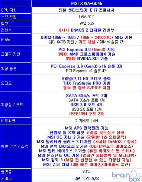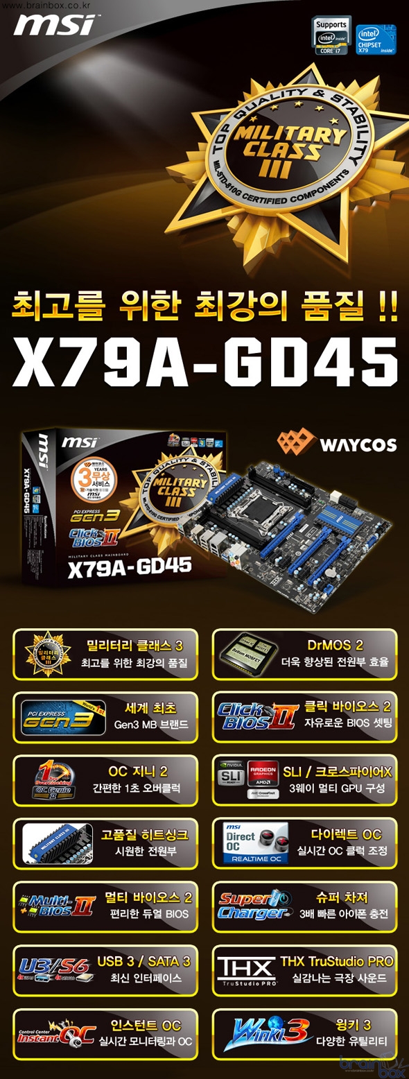 세계 정상급 토탈 IT 솔루션 제조사, MSI의 한국 공식 디스트리뷰터인 ㈜웨이코스(대표:고민종) 가, 최신 인텔 X79 칩셋 기반에 새로운 밀리터리 클래스 3 디자인을 적용한 ‘MSI X79A-GD45’ 메인보드를 출시했다. 더욱 강력해진 품질, MSI 밀리터리 클래스 3 디자인