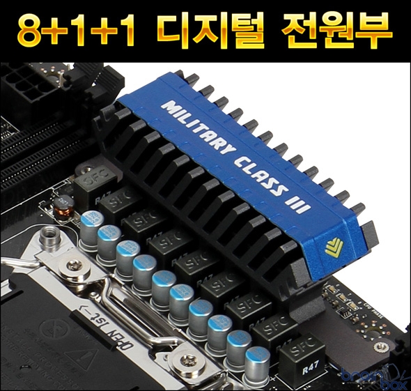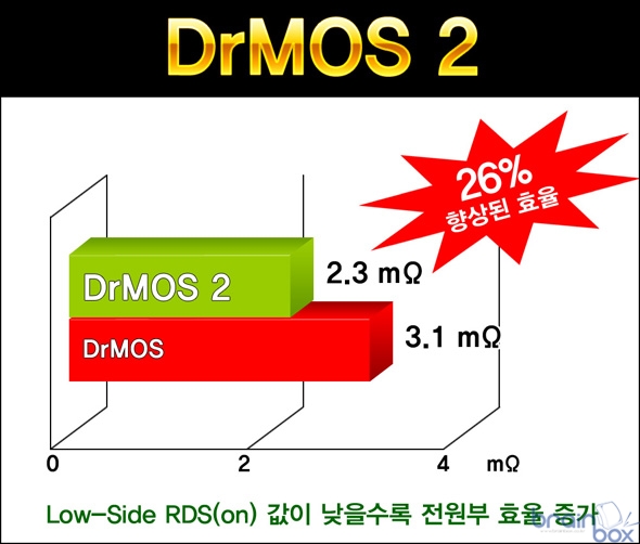 밀리터리 클래스 3 디자인에 새롭게 추가된 DrMOS 2칩셋은, 기존 칩셋에 비해 온도에 따라 2중으로 시스템을 보호할 수 있는 기능이 추가되었으며, Low-Side RDS(on) 값이 기존 DrMOS 칩보다 더 낮아져 발열량이 줄어들었으며, 칩 내부에 흐를 수 있는 전류의 양이 증가되어 전원부 효율이 더욱 증가한 특성을 제공한다.