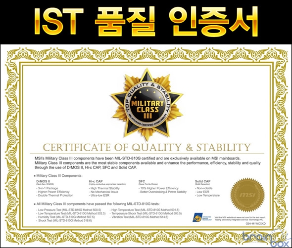 ※ 밀리터리 클래스 3 부품이 통과한 테스트 (MIL STD는 미 국방성 통과 기준) MSI 밀리터리 클래스 3 디자인에 속한 부품들은 우수한 품질과 내구성으로, IST (Integrated Service Technology) 그룹의 공식 인증서를 발급 받았다. IST 는 다양한 하드웨어 제품의 품질과 안전성을 테스트하는 전문 연구기관으로, 습도 / 고온(발열) / 충격 / 진동 등의 다양한 테스트를 미 국방성이 제시한 기준과 동일하게 진행하여 이를 통과한 제품 및 부품에 대해서 품질 인증서를 발급하게 된다. 발급된 IST 품질 인증서는, 소비자가 직접 내용을 확인할 수 있도록 제품 박스 안에 기본 제공된다. 8+1+1 디지털 전원부 ? 더욱 강력해진 전원부