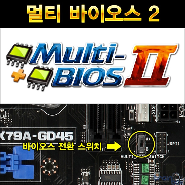 2개의 바이오스 셋팅 화면은 기본적으로 동일한 인터페이스를 채택하여 소비자의 혼동을 최소화 하였으며, 마우스를 통한 간편한 조작은 물론 최신 3TB 하드디스크까지 문제없이 사용할 수 있는 특징을 제공한다. 멀티 바이오스 2 ? 편리한 듀얼 바이오스
