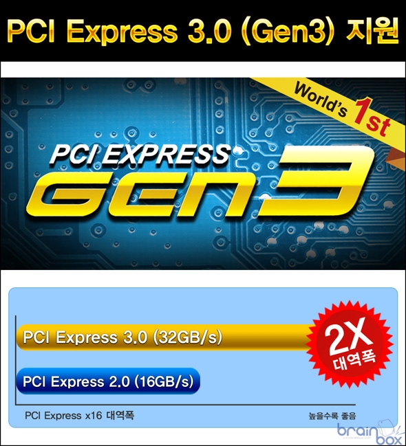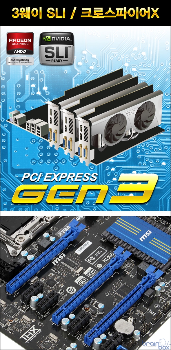 MSI X79A-GD45 메인보드는 차세대 인터페이스인 PCI Express 3.0 을 공식 지원하는 제품이다. 차세대 PCI Express 3.0 인터페이스는 기존 PCI Express 2.0 인터페이스에 비해 2배 더 많은 대역폭(32GB/s) 을 제공한다. 3웨이 Gen3 SLI / 크로스파이어X 공식 지원