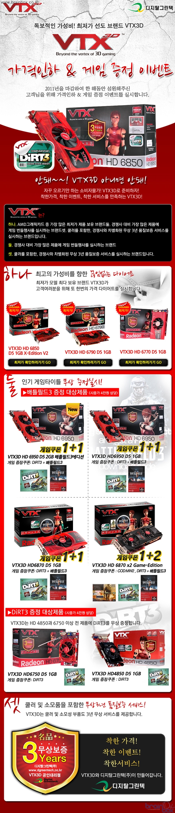 - AMD 최저가제품 최다보유 브랜드 VTX3D, 연말맞이 가격인하 이벤트 실시 VTX3D 국내 공식 디스트리뷰터인 디지탈그린텍㈜(대표 이주영)은 2011년 연말맞이 가격인하 이벤트를 실시한다.