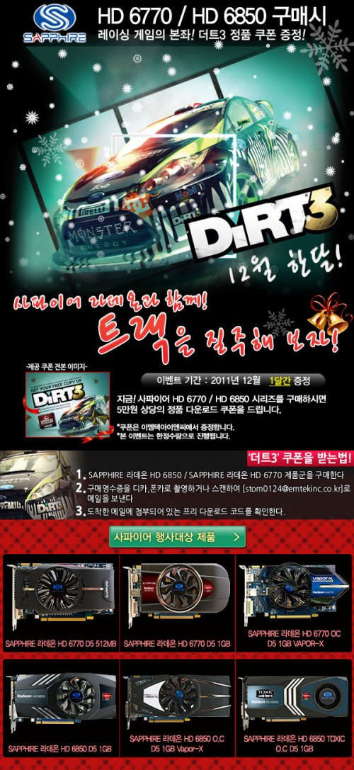 DiRT3 무료 다운로드 쿠폰 제공 행사는 라데온의 대표적인 주류급 그래픽카드인 사파이어 라데온 HD 6850과 HD 6770 그래픽카드 6종으로 진행된다.