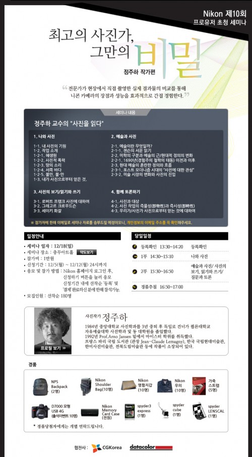 니콘이미징코리아(대표 우메바야시 후지오, www.nikon-image.co.kr)는 정주하 작가와 함께하는 ‘제10회 프로유저 초청 세미나 최고의 사진가, 그만의 비밀’을 오는 18일 서울 중구에 위치한 ‘충무아트홀’에서 개최한다고 밝혔다.