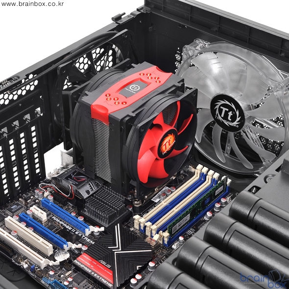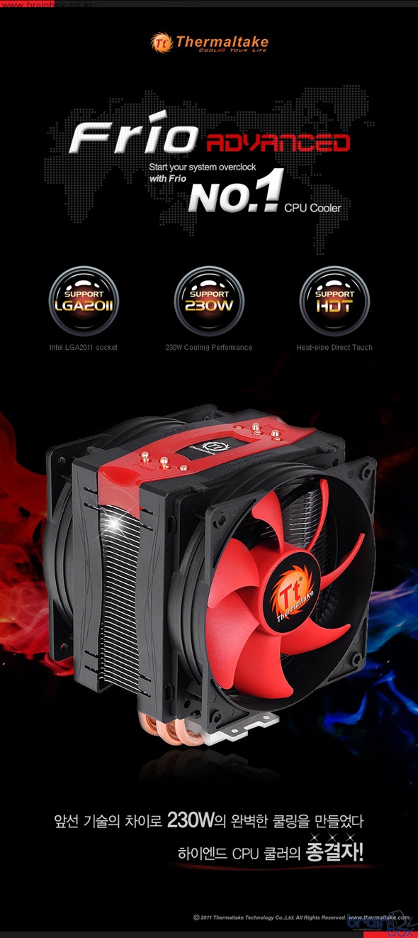 Frio Advanced는 기존 Frio, Frio OCK 시리즈의 후속 모델로 써멀테이크 고유의 블랙&레드 디자인을 채택했으며, 6mm 히트파이프 5개를 다이렉트 터치 방식으로 설계하여 230W급의 강력한 냉각성능을 제공하고 있다.