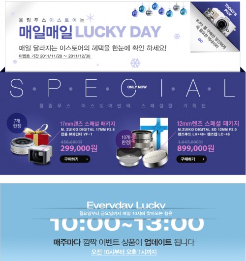 올림푸스한국(대표 방일석 www.olympus.co.kr)은 연말을 맞아, 오는 30일 까지 직영 쇼핑몰 이스토어(www.olympus.co.kr/estore)에서 ‘매일매일 럭키데이’ ‘렌즈 스페셜 패키지 기획전’ 등 다양한 제품 할인 및 추가 증정이벤트를 마련했다.