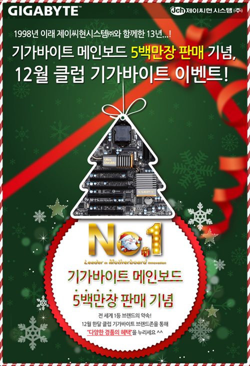 제이씨현시스템(대표 차현배 www.jchyun.com)에서 기가바이트 메인보드 13년 누적 500백만장 판매를 기념하여, 인텔 X79/Z68/P67, AMD990FX/970/A75  등 인기 메인보드를 구매하는 고객에게 기가바이트 게이밍 레이저 마우스 & 마우스패드 세트, 큐센 키보드 및 27인치 유디아 LED 모니터 등을 경품으로 증정하는 "기가바이트 5백만장 판매 기념, 고객 사은 경품 이벤트"를 진행 한다고 밝혔다.