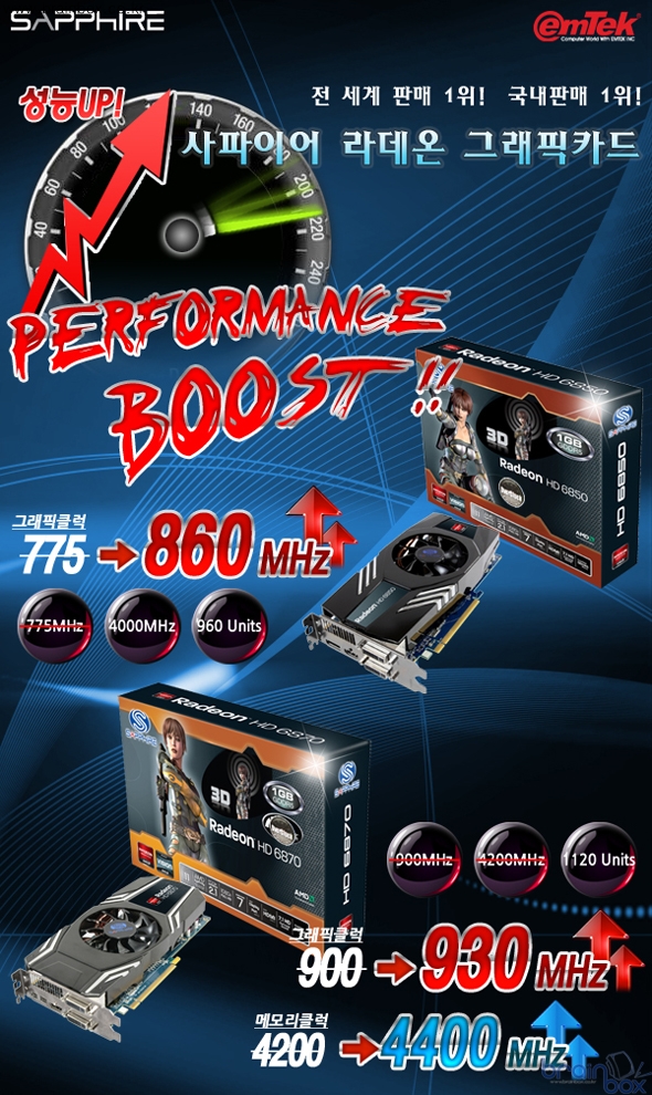 - 사파이어 라데온 HD 6870 / HD 6850 동작 속도 상향 조정으로 성능 향상 이뤄 국내 컴퓨터 그래픽카드 시장을 선도하고 있는 (주)이엠텍아이엔씨(대표:이덕수, www.emtekinc.com)는 뛰어난 가격 대비 성능으로 호평받고 있는 <SAPPHIRE Radeon HD 6800 시리즈> 그래픽카드의 동작 클럭을 올려 성능 향상을 도모한 특별 서비스 제품을 선 보인다. 라데온 그래픽카드 수요의 주류를 이루고 있는 퍼포먼스급 그래픽카드의 대표 주자인 <SAPPHIRE Radeon HD 6870>과 <SAPPHIRE Radeon HD 6850>이 대상이며 소비자 가격은 종전 그대로 유지한 채 성능만 상향시켜 시장에 내놓는다.