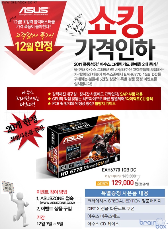 ASUStek사의 국내유통사인 에스티컴퓨터(http://www.stcom.co.kr , 대표 서희문)는 자사 직영 온라인 쇼핑몰인 아수스존 (www.asuszone.com)에서 20개 한정 수량으로 EAH6770 1GB DC를 구매하는 고객을 대상으로 정품 게임 다운로드 쿠폰 등 5만원 상당의 경품을 증정하는 고객감사 이벤트를 실시한다.