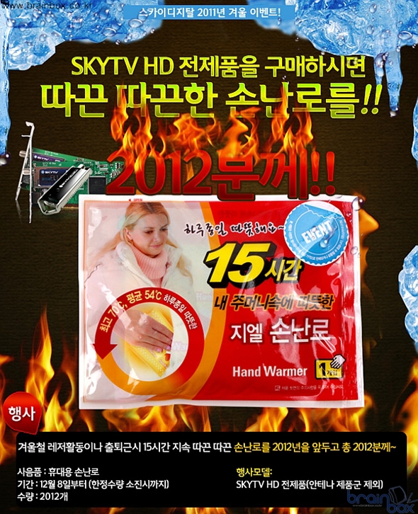 이번 이벤트는 스카이디지탈의 안테나 제품군을 제외한HDTV수신카드 및 셋탑박스 등 SKYTV HD 전제품에 해당되며, 12월 8일부터 제품구매 고객에게 2012년을 앞두고 총 2,012개 한정수량 소진시까지 증정한다. 선물로 증정되는 손난로는 따뜻한 온기가 15시간 지속되어 겨울철 야외 활동시 하루종일 사용할 수 있다.