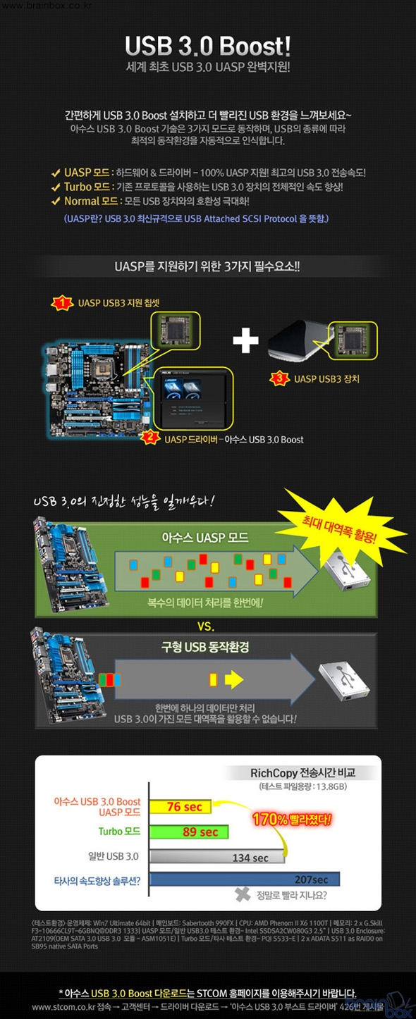 ASUStek사의 국내유통사인 에스티컴퓨터(http://www.stcom.co.kr , 대표 서희문)는 기존 USB 3.0 대비 최대 170%의 성능향상이 이뤄진 USB 3.0 부스트 드라이버를 공개하고 지원 메인보드 리스트를 발표했다. 현재는 LGA 2011 소켓을 탑재한 X79 메인보드와 LGA1155 소켓을 사용하는 Z68 주요 메인보드에서 사용이 가능하다.
