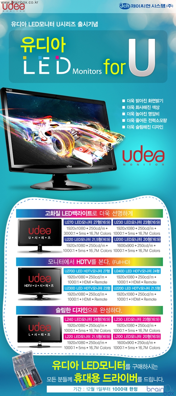 한편, 제이씨현시스템㈜ 에서는 신제품 U시리즈 모니터 출시를 기념하여, L시리즈, LED HDTV모니터 U시리즈를 구매하면 소형 드라이버세트를 증정하는 이벤트를 한달 동안 진행한다. |