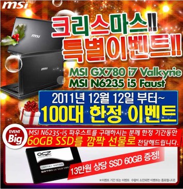 MSI 공식 유통사 엔씨디지텍에서 MSI 노트북 구매자 대상으로 12월 13일부터 SSD 60GB를 증정하는 이벤트를 진행 중이다.