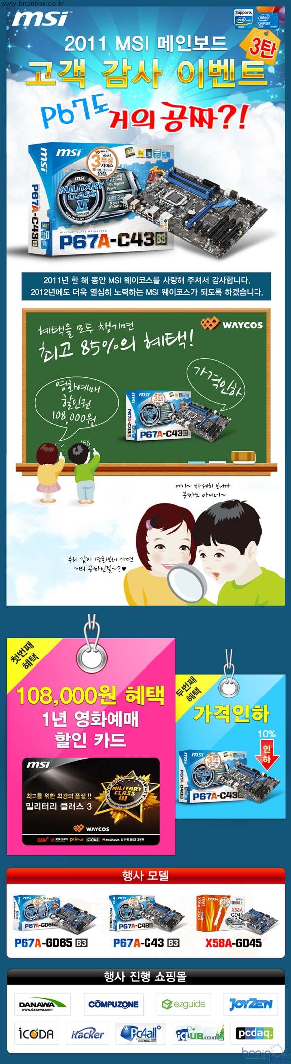 세계 정상급 토탈 IT 솔루션 제조사, MSI의 한국 공식 디스트리뷰터인 ㈜웨이코스(대표:고민종) 가, MSI 웨이코스 P67 / X58A 메인보드 구매자에게 가격인하와 함께 특별한 혜택을 증정하는 고객 감사 이벤트를 실시한다 2011 MSI 메인보드 고객 감사 이벤트 3탄 : MSI P67 / X58 메인보드, 2가지 특별 혜택 제공 금번 프로모션은 2011년 MSI 메인보드를 사랑해 주신 한국 소비자 분들의 성원에 감사 드리기 위해, MSI Z68A 시리즈 가격인하에 이어 3탄으로 진행하는 특별 프로모션이다. 금번 프로모션은 2011년을 한 해를 마무리하며 1년 동안 MSI 웨이코스 메인보드 제품을 사랑해주신 소비자 분들에게 감사하는 의미로 MSI 웨이코스 P67A / X58A 메인보드 제품 구입시 특별한 혜택을 드리는 프로모션이다.