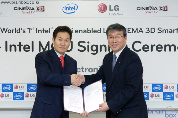 LG전자(066570, 대표 具本俊, www.lge.co.kr)가 영상을 무선으로 전송하는 기술과 관련해 인텔과 전략적 제휴를 체결하고 공동마케팅을 전개하기로 했다. 15일 양측은 서울 여의도 LG트윈타워에서 LG전자 TV사업부장 노석호 전무, 인텔코리아 이희성 대표 등이 참석한 가운데 ‘인텔 무선 디스플레이(WiDi) 기술 전략적 제휴’에 관한 양해각서를 교환했다.