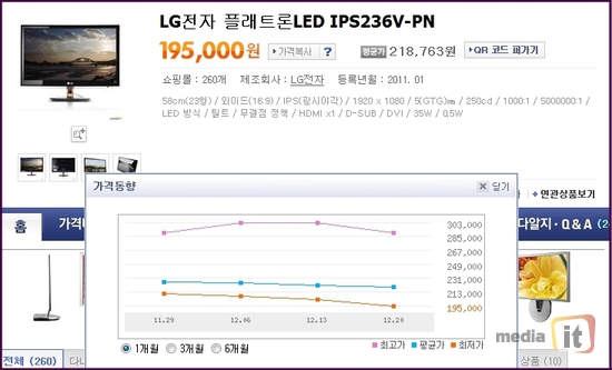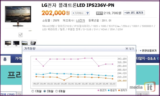 ▲ 2011년 12월 21일 '플래트론LED IPS236V-PN'의 최저가 가격