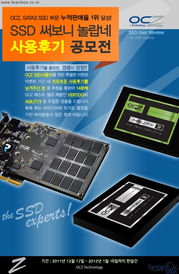 OCZ Technology사의 한국 디스트리뷰터인 ㈜아스크텍(대표:신형식 www.ask-tech.com/ocz)은 오는 12월17일부터 한 달간 국내 판매중인 OCZ SSD 전 제품에 대한 사용후기를 공모하는 이벤트를 진행한다. 이번에 열리는 사용후기 공모 이벤트는 2011년 국내 SSD(SATA3 부문) 누적 판매율 1위 달성을 기념하여 OCZ 제품의 사용만족도, 서비스만족도, 개선할 점, 최적화 노하우, 벤치테스트, 사용 가이드 등 자유로운 주제의 유익한 내용이 적힌 사용기라면 누구나 참여할 수 있다. 참여 방법은 가격비교 사이트 다나와(www.danawa.com)에서 자사 SSD에 대한 사용기를 등록한 후 온라인 신청서(http://db.blueweb.co.kr/formmail/Newformmail.html?dataname=ocztech0)를 작성하면 자동으로 응모된다.