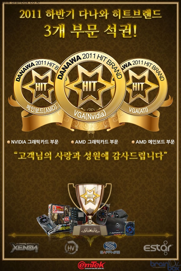 - NVIDIA, AMD 그래픽카드와 AMD 메인보드 부문 히트 브랜드 수상의 영예 안아. 국내 컴퓨터 그래픽카드 시장을 선도하고 있는 (주)이엠텍아이엔씨(대표:이덕수, www.emtekinc.com)가 가격비교사이트 다나와에서 주관하는 <2011년 다나와 히트 브랜드>에서 3개 부문을 석권하며 선정되는 영예를 차지했다.