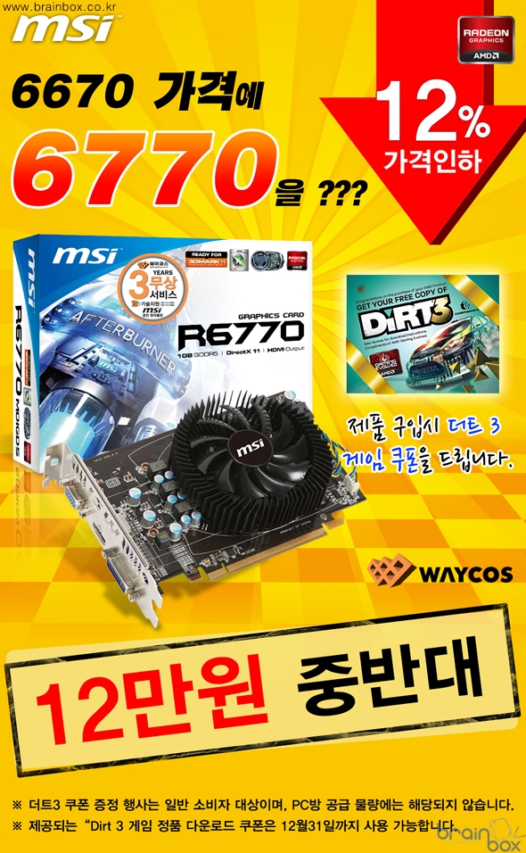 세계 최고의 VGA 제조 기술력을 갖춘, MSI의 한국 공식 디스트리뷰터인 ㈜웨이코스(대표:고민종)가, 중급형 시장에서 꾸준한 인기를 얻고 있는 MSI R6770 제품의 가격을 12% 인하한다. ㈜웨이코스는 2011년 MSI 웨이코스 그래픽카드를 사랑해 주신 한국 소비자에게 감사 드리는 의미로, 라데온 6670 가격에 R6770 1GB 제품을 구입할 수 있도록 12% 가격인하 한다.
