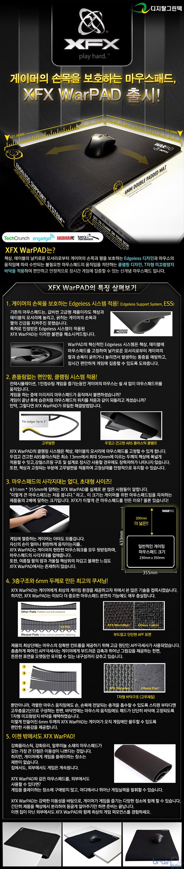 - 게이머의 손목을 보호하는 Edgeless 시스템 적용 PC관련 주변기기 전문 유통사 디지탈그린텍㈜(대표 이주영)은 게이머의 손목을 보호하는 신개념 마우스패드, XFX WarPAD를 출시한다. 431mm * 355mm의 초대형 사이즈를 자랑하는 XFX WarPAD는 여타 마우스패드의 2배에 가까운 큰 사이즈로, 게이머의 모든 마우스 움직임을 지원하는것은 물론, 여름철이나 겨울철, 유리가 올려지는 등 다양한 책상 표면에 팔이 직접 닿으면서 생기는 불편함을 없애준다.