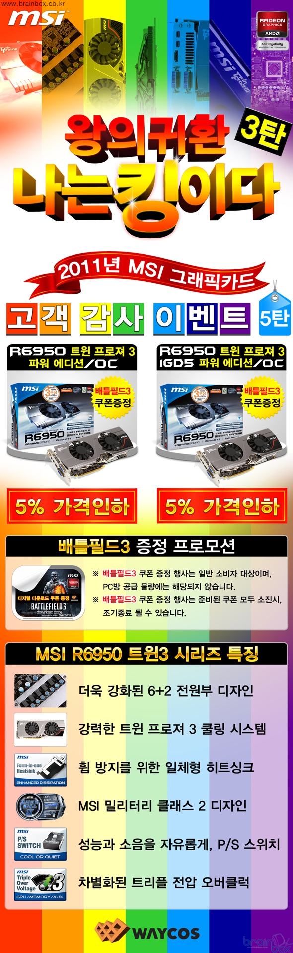 세계 최고의 VGA 제조 기술력을 갖춘 MSI의 한국 공식 디스트리뷰터인 ㈜웨이코스(대표:고민종) 가, 2011 MSI 그래픽카드 고객 감사 이벤트 5탄으로 MSI R6950 트윈3 시리즈 제품의 가격을 인하한다고 밝혔다. 2011 MSI 그래픽카드 고객 감사 이벤트 5탄 : MSI R6950 트윈3 시리즈 가격인하